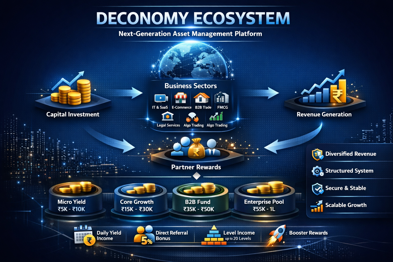 A New Era of Sustainable Yields We are thrilled to announce the official launch of our diversified ecosystem. Unlike traditional financial models that rely on simple market speculation, our platform aggregates partner capital and strategically deploys it across 6 high-growth corporate sectors: IT Services, Corporate Legal Consulting, B2B Trade, D2C E-Commerce, FMCG Distribution, and Algorithmic Trading. By bypassing the middlemen and directly injecting liquidity into these sectors, we are able to capture real corporate margins and distribute them back to our partners as daily yields. Our Commitment to Transparency Our infrastructure is built on absolute transparency and compliance. Our bi-monthly payout system ensures that corporate liquidity is maintained, preventing the structural collapses often seen in rapid-withdrawal platforms. Every transaction is subject to standard Government TDS deductions, ensuring your wealth grows securely and legally. We invite you to deploy your capital, track your live ecosystem margins on your dashboard, and build your partner network to unlock our exclusive 20-level yield distributions. Welcome to the revolution. Welcome to Deconomy.